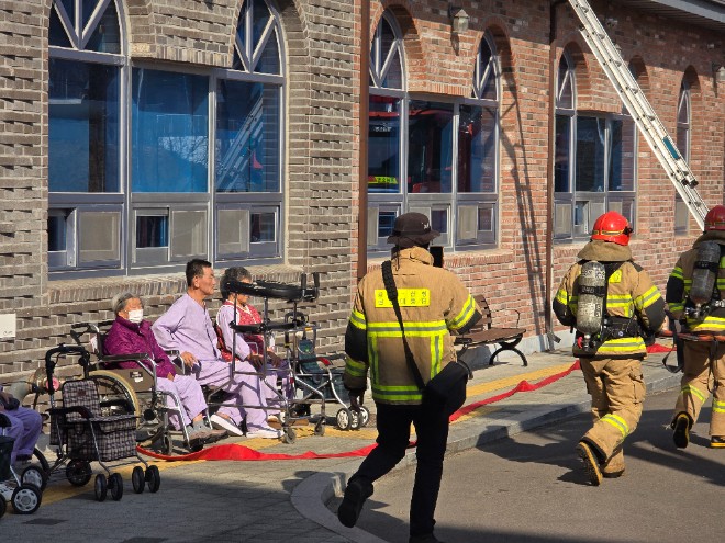 재난산황 중 건물 화재시 대피훈련 산청소방서와 함께 화재 발생시 대피하는 훈련을 어르신들과 함께 진행합니다. 빠르게 대피하는 방법을 익히고 안전하게 대피하는 방법을 익히게 됩니다. |